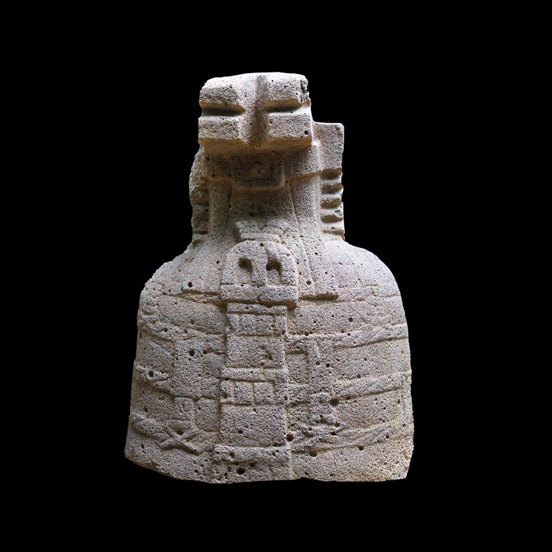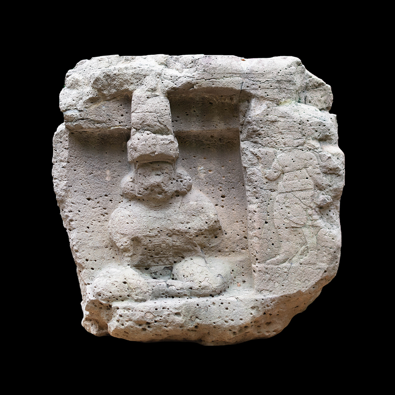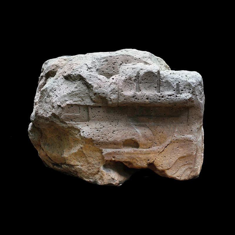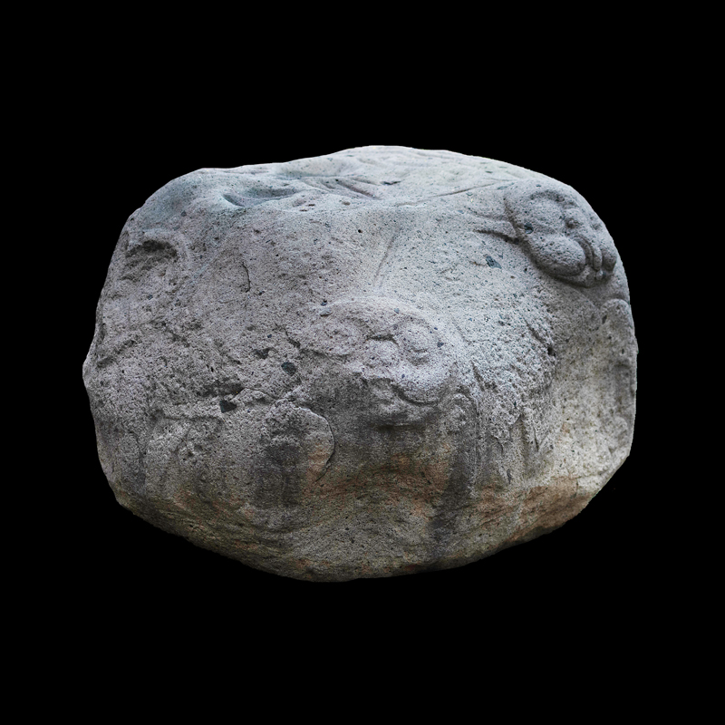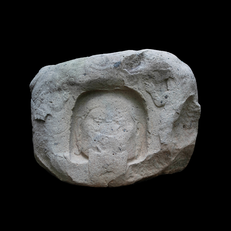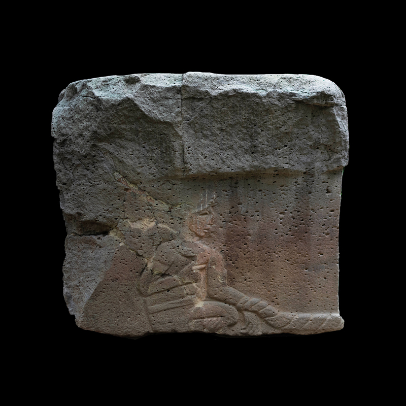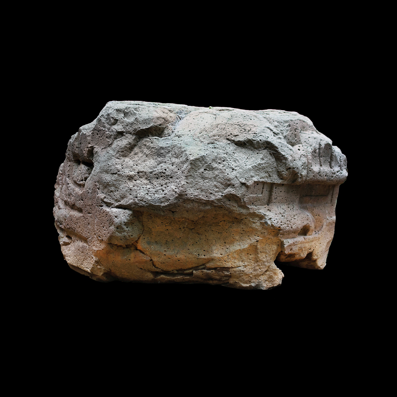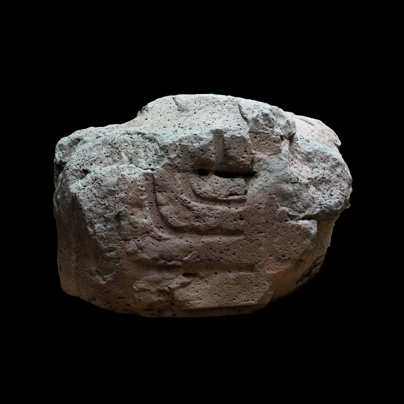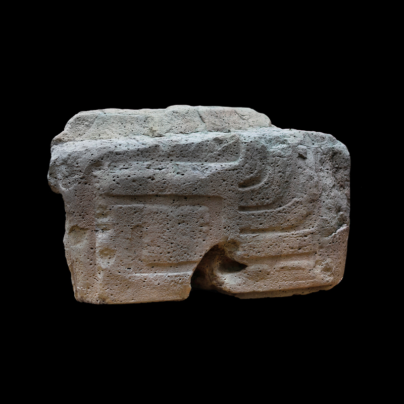 Este enorme bloque rectangular de basalto, que simula en la parte superior las fauces abiertas de un ser fantástico felino cocodriliano, presenta la imagen de una mujer que, excepcionalmente, aparece en altorrelieve. Ataviada sencillamente con una corta falda formada por varias tiras, porta unas orejeras extrañamente alargadas. Lleva un gorro o casco y a la altura de la frente un medallón, desde donde corre una banda alrededor de la cabeza.