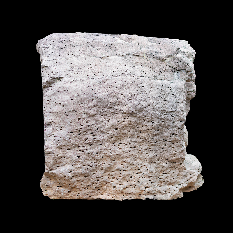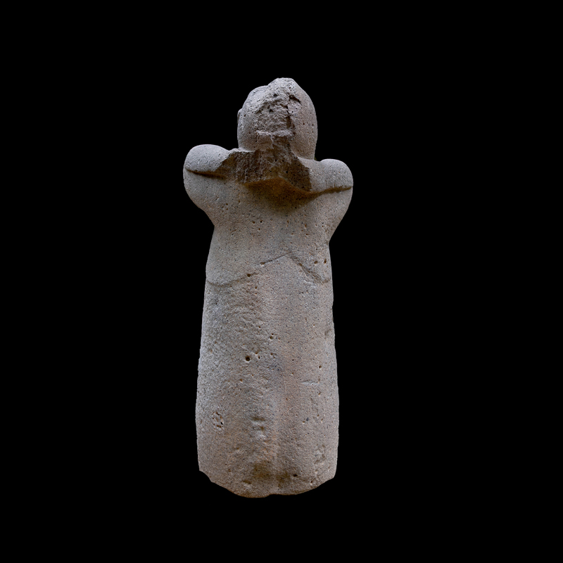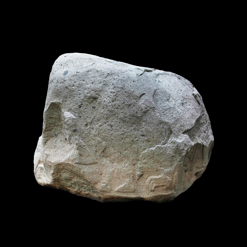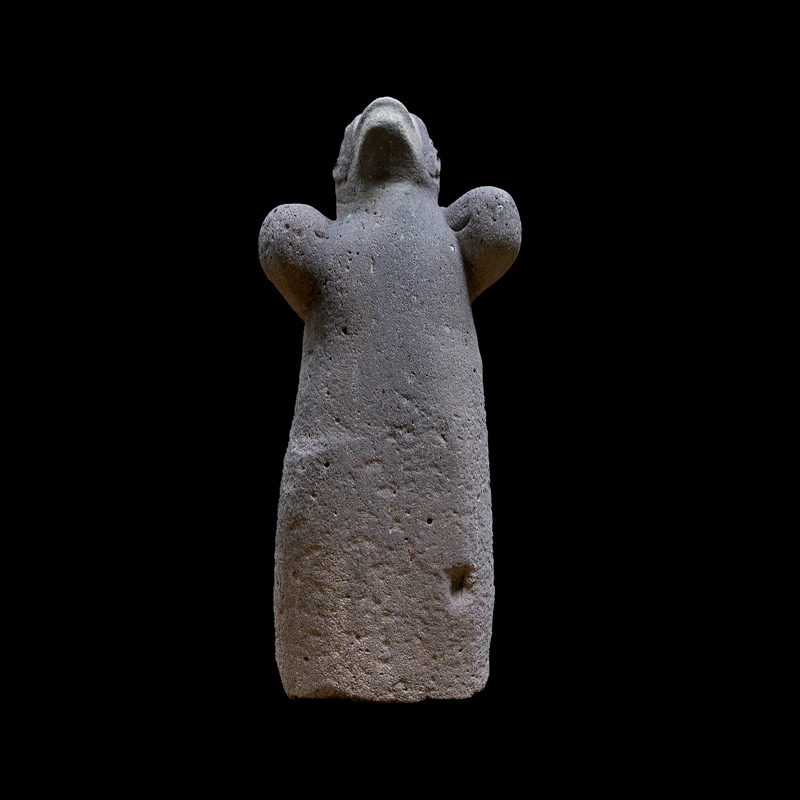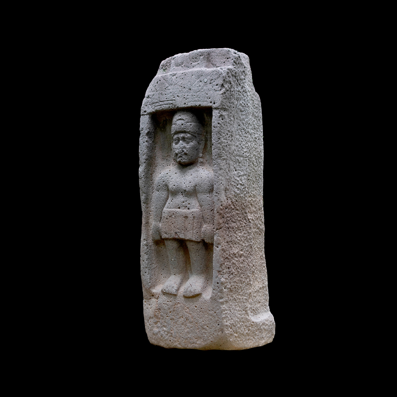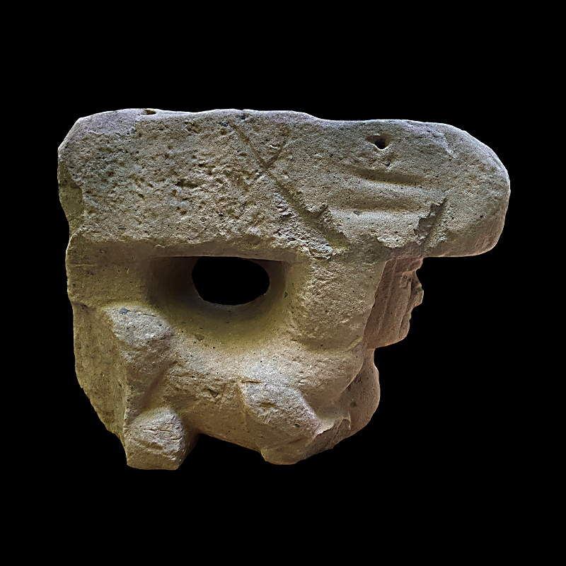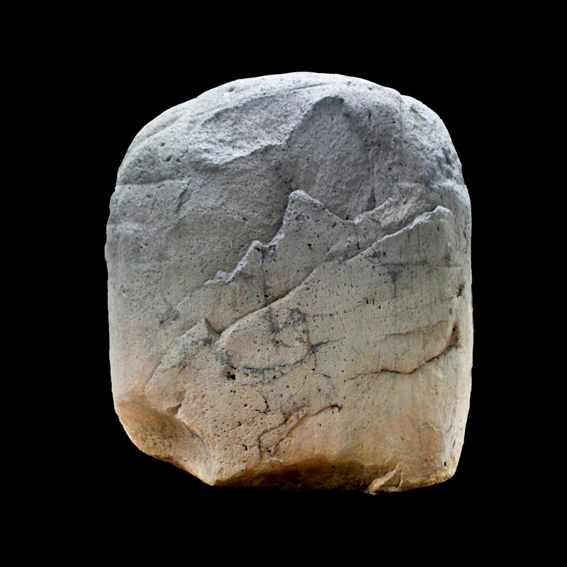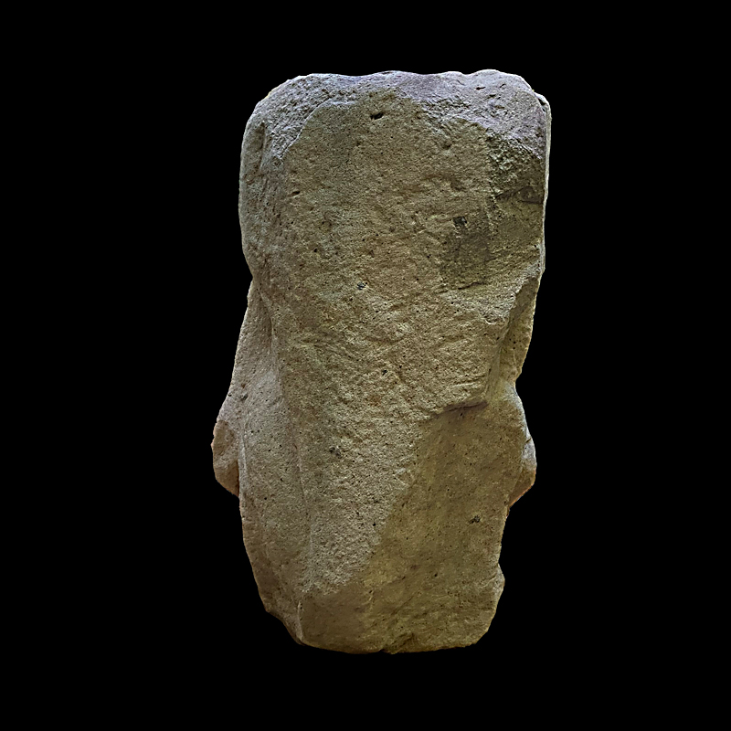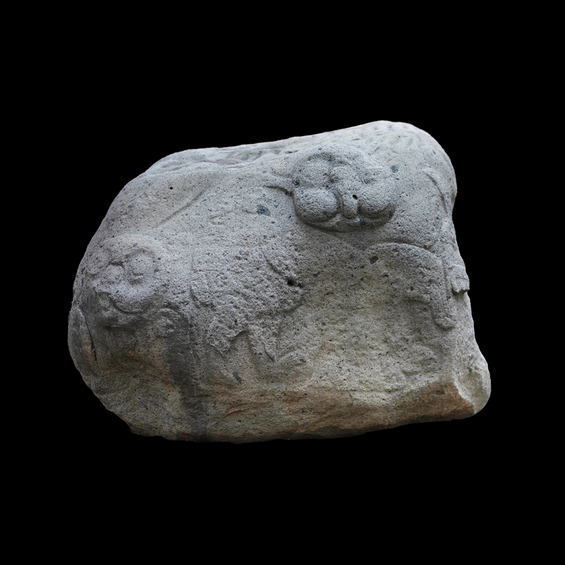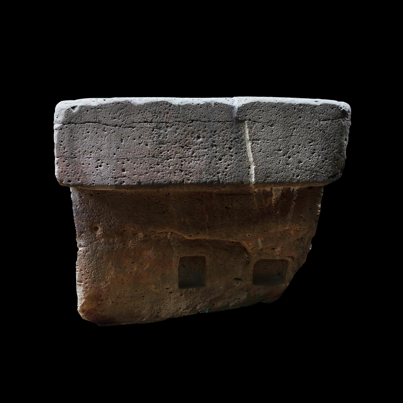 Este enorme bloque rectangular de basalto, que simula en la parte superior las fauces abiertas de un ser fantástico felino cocodriliano, presenta la imagen de una mujer que, excepcionalmente, aparece en altorrelieve. Ataviada sencillamente con una corta falda formada por varias tiras, porta unas orejeras extrañamente alargadas. Lleva un gorro o casco y a la altura de la frente un medallón, desde donde corre una banda alrededor de la cabeza.