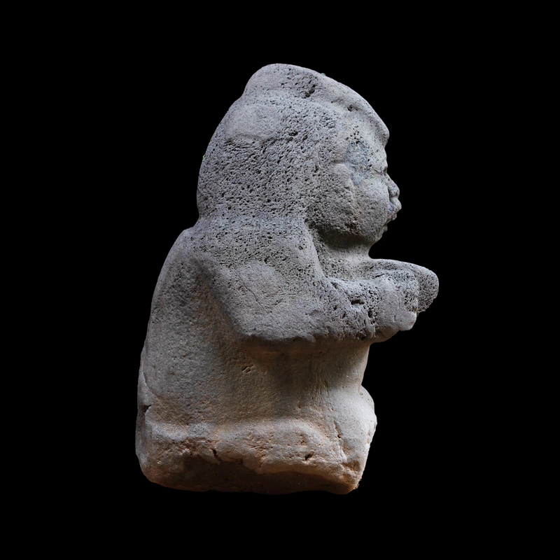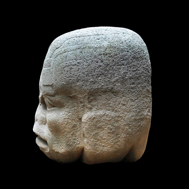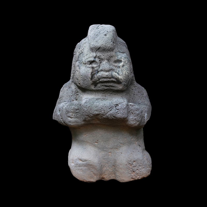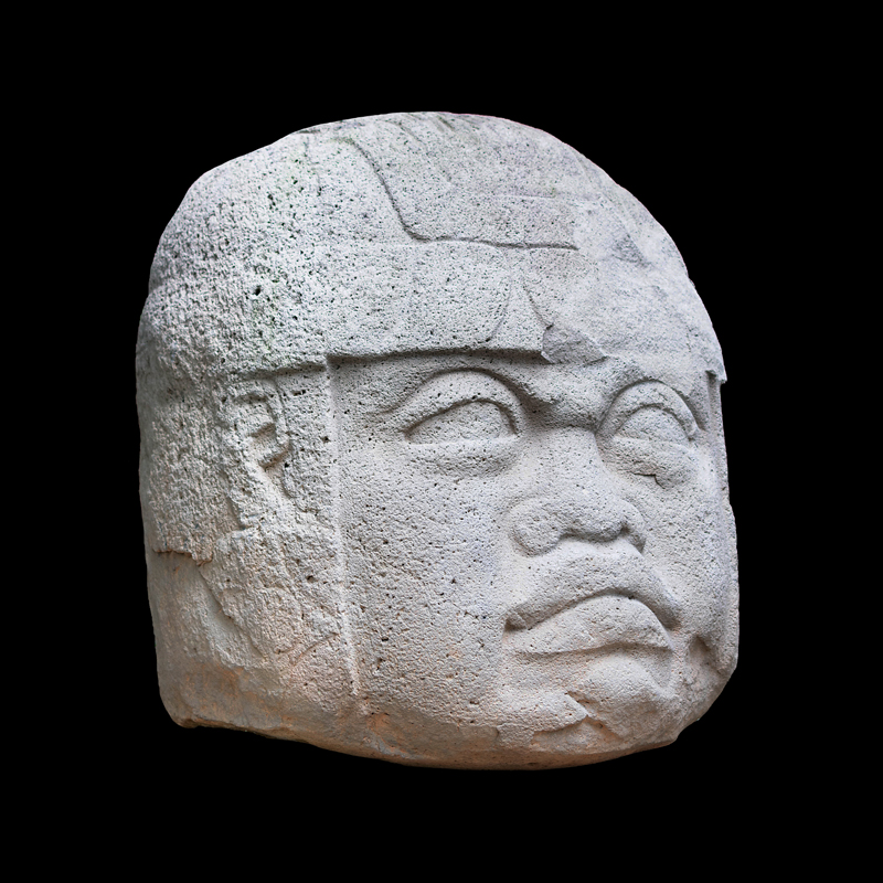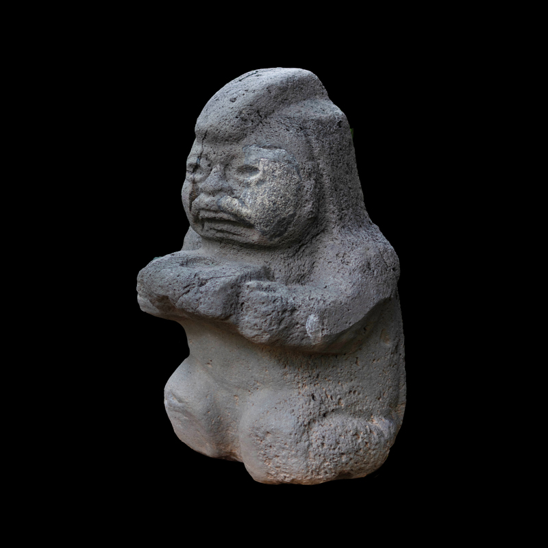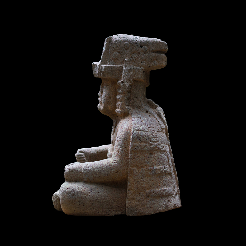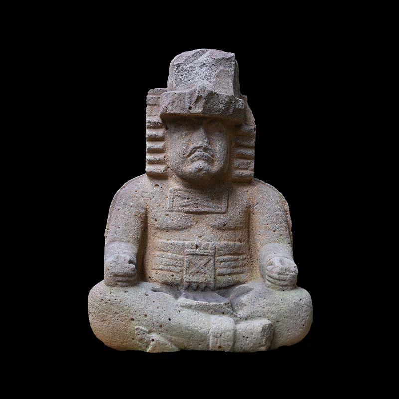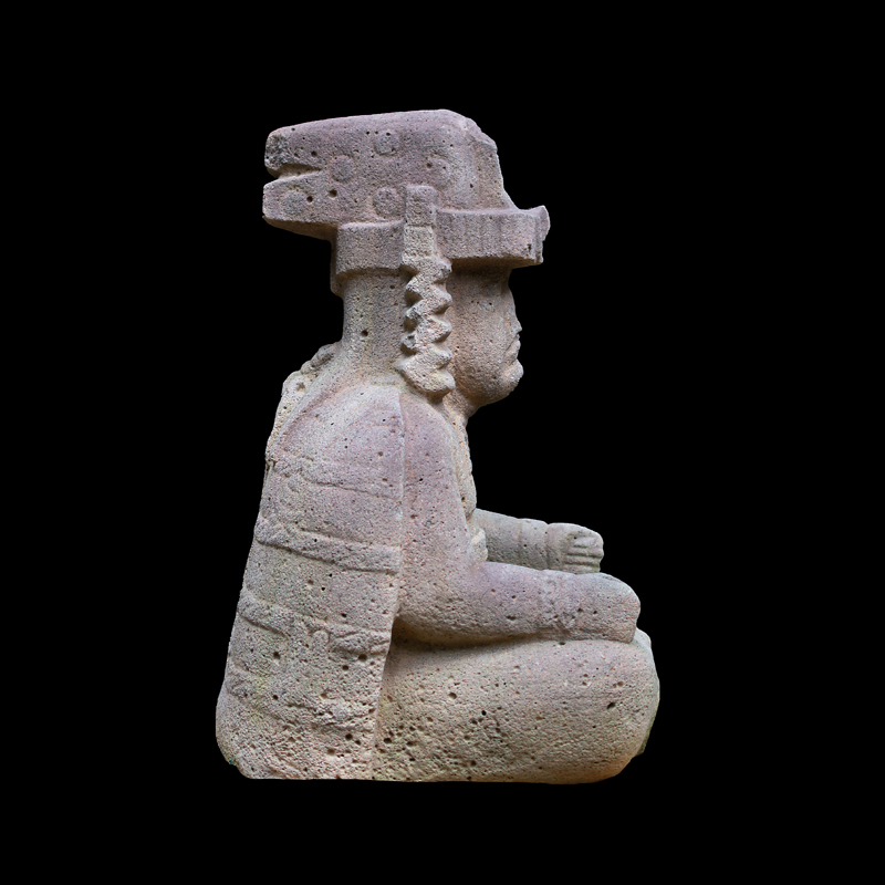 La cultura Olmeca fue de las primeras en trabajar la escultura exenta o en bulto, utilizando grandes bloques de basalto. Se observa una figura humana sedente con las piernas cruzadas y los puños descansando sobre sus muslos; el personaje debió ser un alto dignatario por el atavío que porta; una capa ricamente elaborada, el pectoral en su pecho en forma de cruz y el tocado sobre la cabeza que se proyecta hacia atrás. Los adornos que caen sobre sus orejas como si fuera papel plegado son similares a los adornos de otras esculturas de asentamientos olmecas vecinos, San Lorenzo y el Azuzul, en Veracruz.