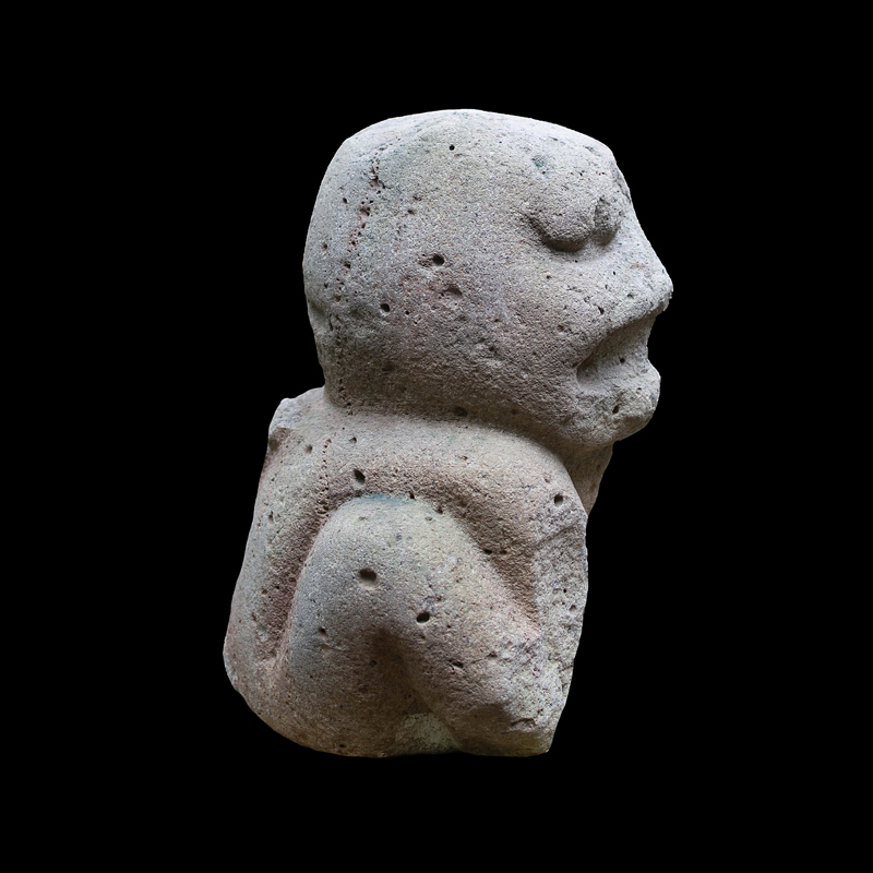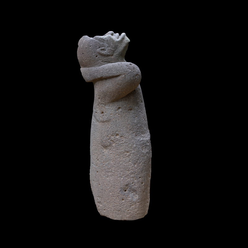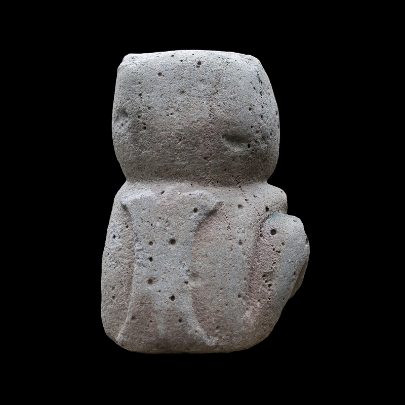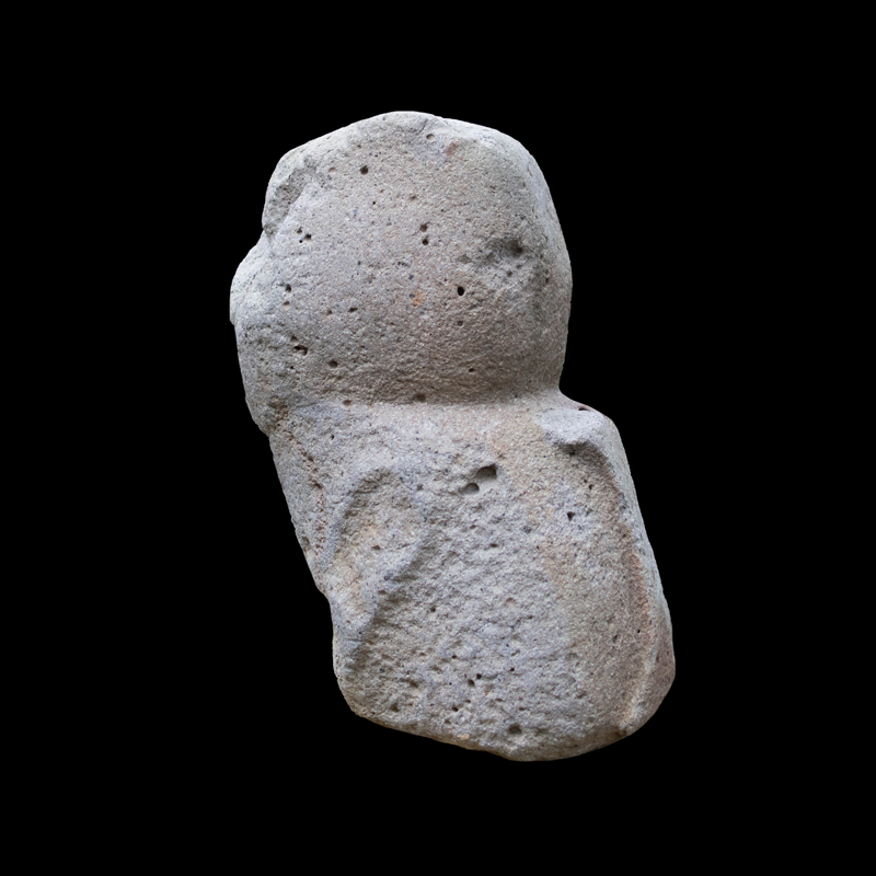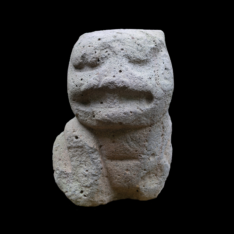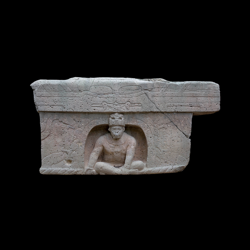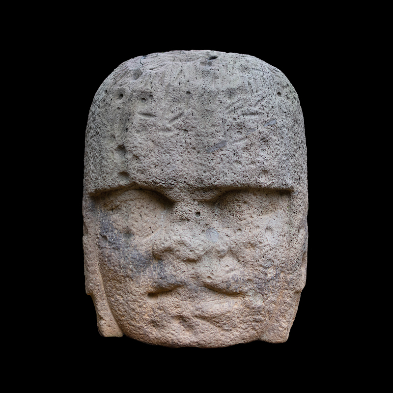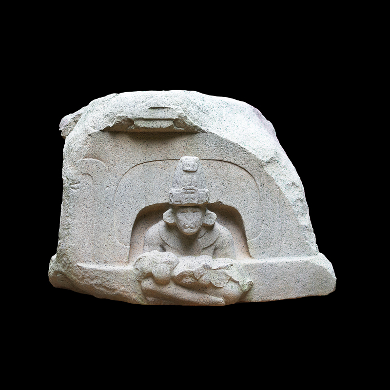 La cultura Olmeca fue de las primeras en trabajar la escultura exenta o en bulto, utilizando grandes bloques de basalto. Se observa una figura humana sedente con las piernas cruzadas y los puños descansando sobre sus muslos; el personaje debió ser un alto dignatario por el atavío que porta; una capa ricamente elaborada, el pectoral en su pecho en forma de cruz y el tocado sobre la cabeza que se proyecta hacia atrás. Los adornos que caen sobre sus orejas como si fuera papel plegado son similares a los adornos de otras esculturas de asentamientos olmecas vecinos, San Lorenzo y el Azuzul, en Veracruz.