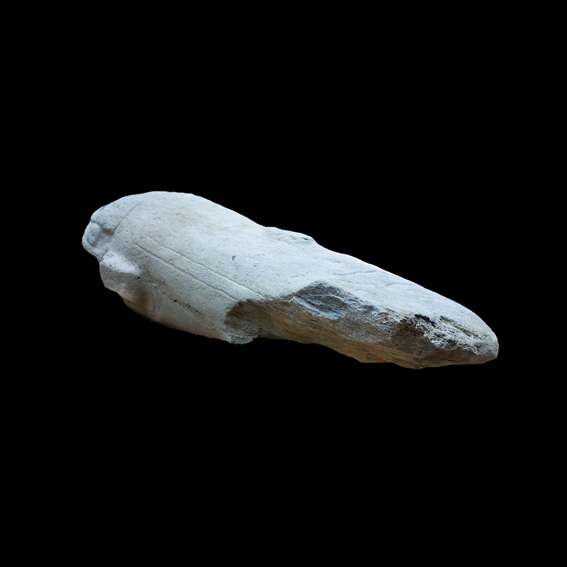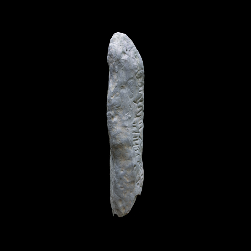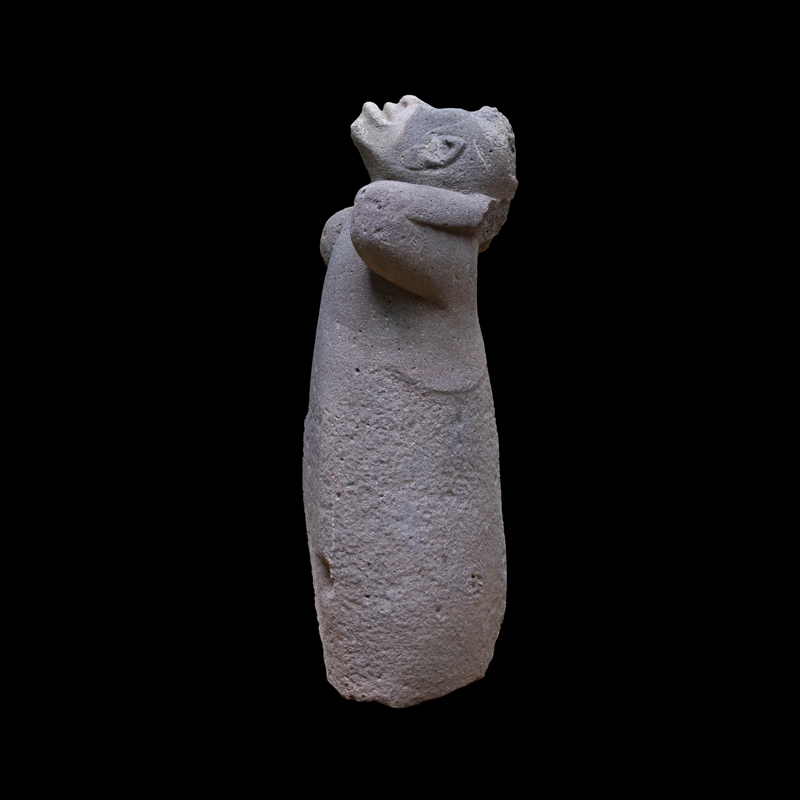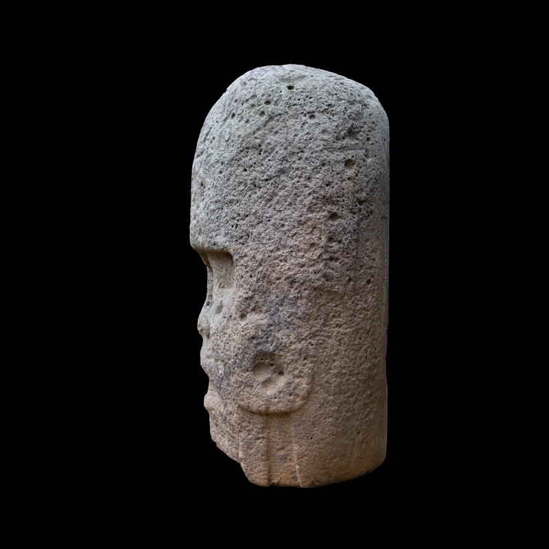 Es muy probable que esta escultura estuviera de manera original empotrada de forma horizontal, es decir la parte que simula ser su cuerpo es la espiga que la sostenía como parte de un elemento arquitectónico de algún edificio. Este monumento fue esculpido en andesita aprovechando la forma natural de la columna.