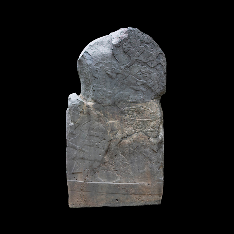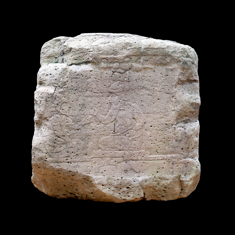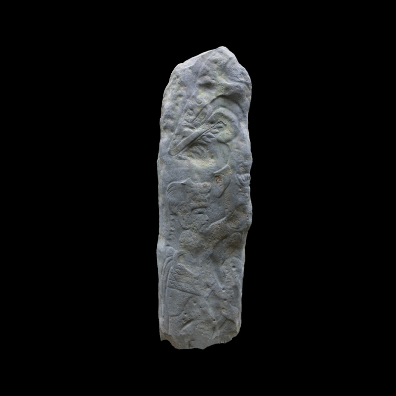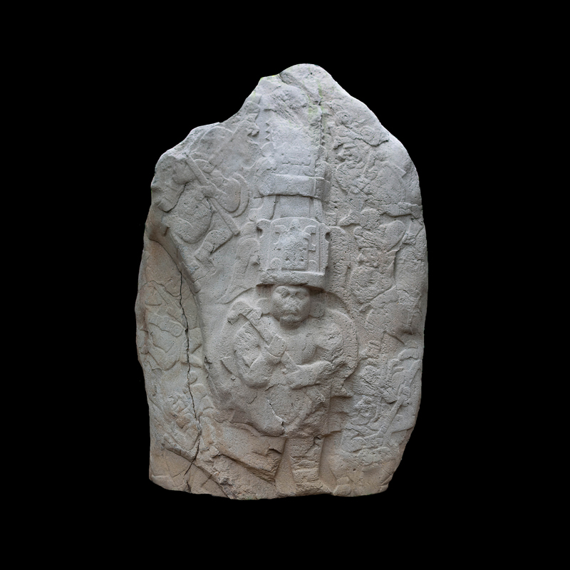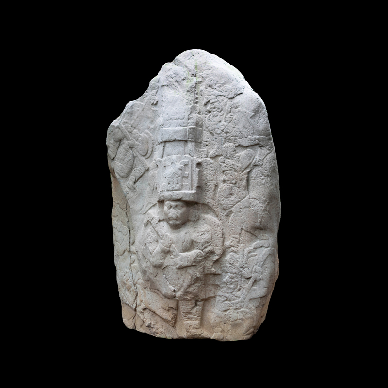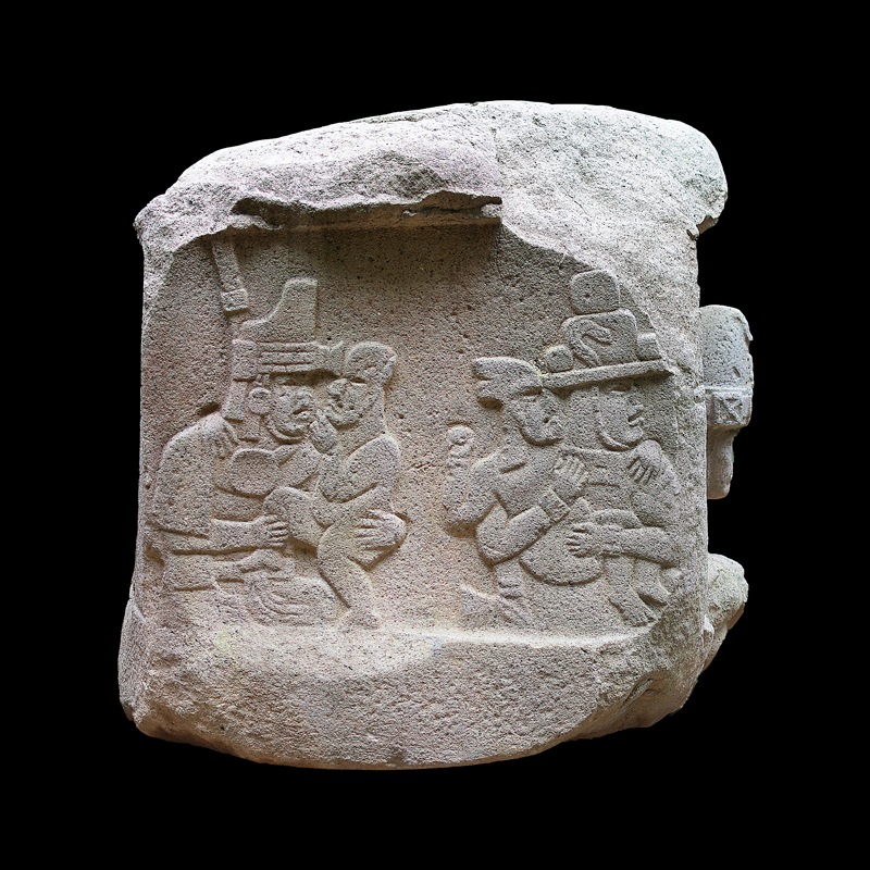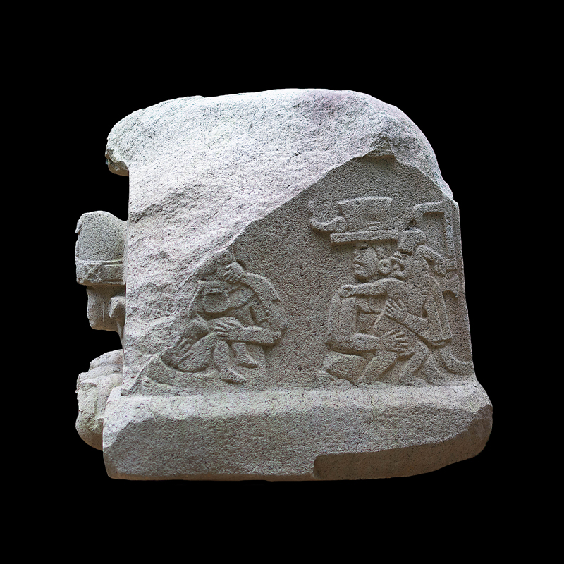 Escultura en la que se representó en bajorrelieve algún tipo de narración y en la que se aprecia un cambio en el estilo escultórico de la cultura Olmeca. Dos personajes centrales frente a frente quizá de la misma jerarquía social a decir por sus ricas vestimentas y la complejidad de sus adornos nos permiten apreciar sus diferencias físicas. Seis figuras en movimiento todas portando gorros y bastos aparecen como flotando acompañando a los personajes centrales. Sobresalen dos de ellos que cargan animales sobre sus espaldas.